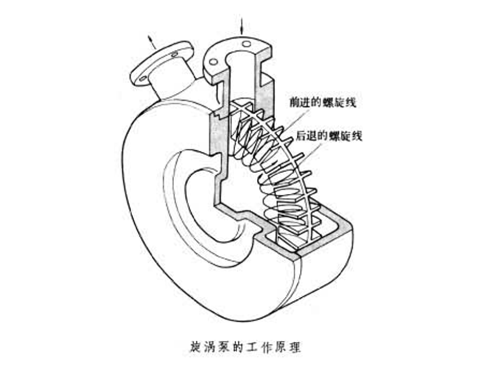 旋渦泵的葉輪為一等厚圓盤,在它外緣的兩側(cè)有很多徑向小葉片。在與葉片相應(yīng)部位的泵殼上有一等截面的環(huán)形流道,整個流道被一個隔舌分成為吸、排兩方,分別與泵的吸、排管路相聯(lián)。