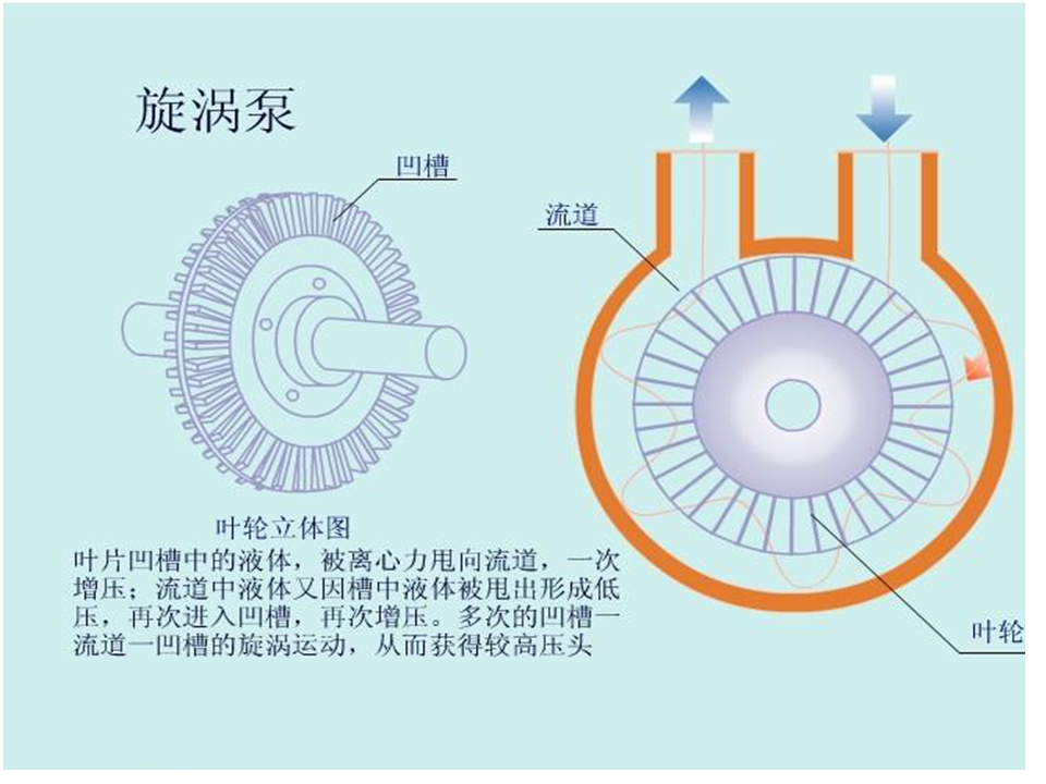 旋渦泵就是靠旋轉(zhuǎn)葉輪對液體的作用力,在液體運動方向上給液體以沖量來傳遞動能以實現(xiàn)輸送液體。